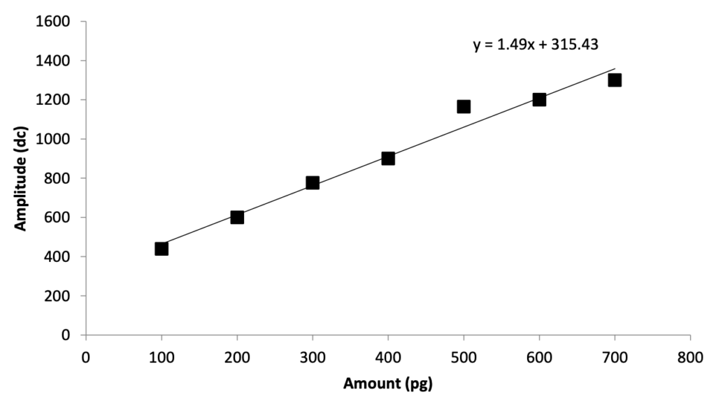 Intercept (315.43): Even at 0 pg, the baseline signal is around 315 digital counts, likely due to background noise or residual ionization effects.