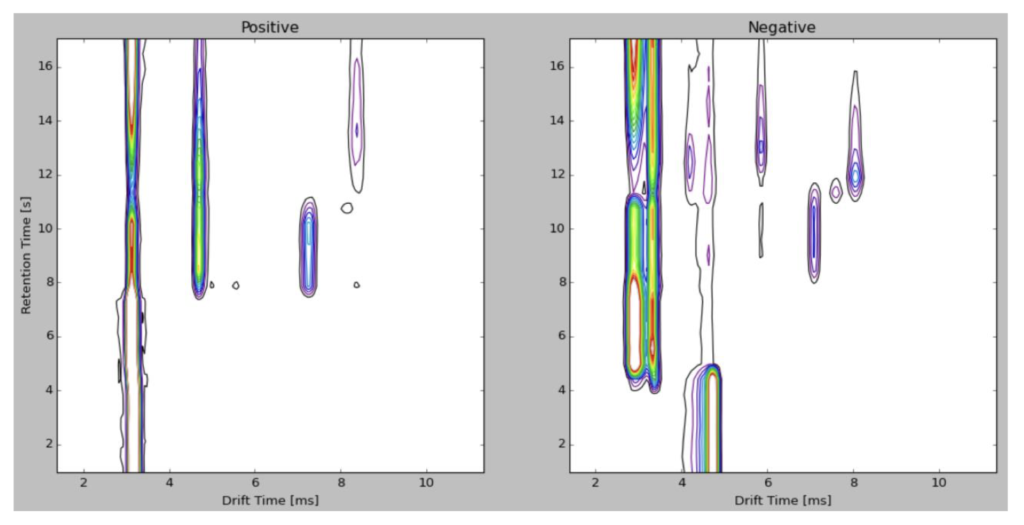 • The X-axis represents Drift Time (ms) (how long it takes ions to travel through the drift tube).