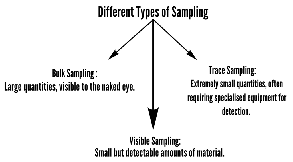 Aspiration sampling involves drawing air through a filter to collect chemical traces. The sample is then analysed for contaminants. Common air contaminants include Particulates (e.g, aerosols, dust, fumes, smokes, mists), Vapours (e.g, chemical residues from explosives or drugs), Gases (e.g, atmospheric pollutants).